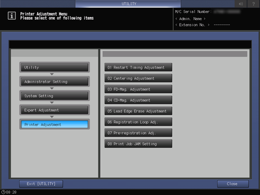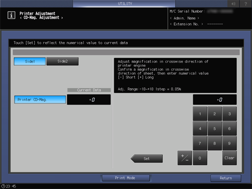 This operation is the same as that in Adjustment - Machine Adjustment - Printer Adjustment - CD-Mag. Adjustment, accessed from the MACHINE screen.