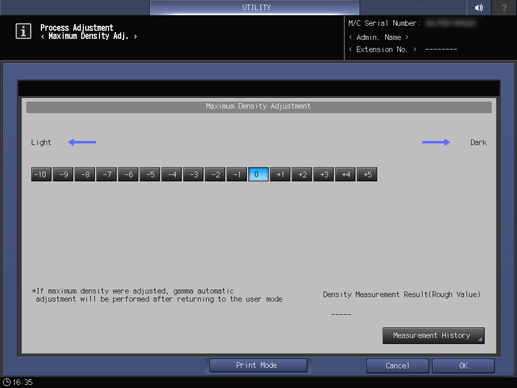 5. After outputting the charts, the screen returns to the Maximum Density Adjustment screen and the measurement result is displayed under Density Measurement Result (Rough Value) in the lower right of the screen.