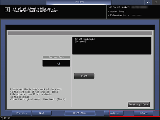 supplementary explanationIf the gradation appears widely misaligned in highlights of the image, press Reset Adj. Data to set the highlight value to 0, then press Readjust.