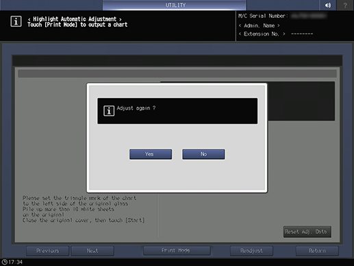 A test pattern is printed, and the screen automatically returns to the Highlight Automatic Adjustment screen.