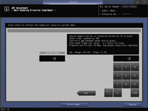 Press System Setting on the Administrator Setting Menu screen, and then press Expert Adjustment, ADF Adjustment, and Main Scan Dir. Zoom (Back) in sequence.