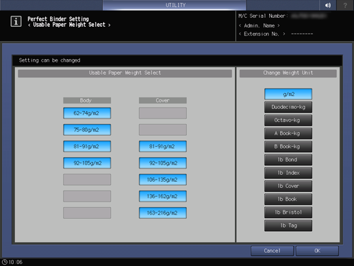 Specify the paper weight available for each of body and cover when using the perfect binder.