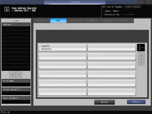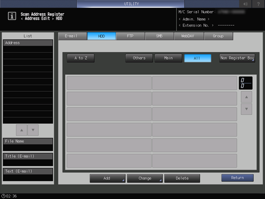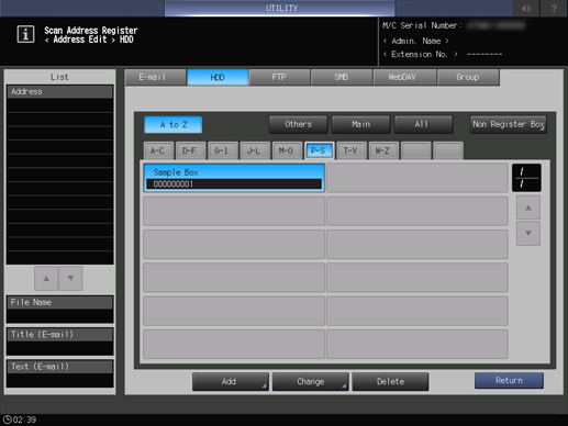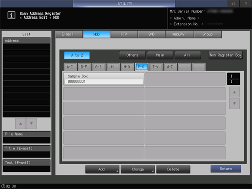 If you press Non Register Box displayed on the Scan Address Register screen (UTILITY - Scan Address Register - Address Edit - HDD), the boxes not registered in the destination are listed.