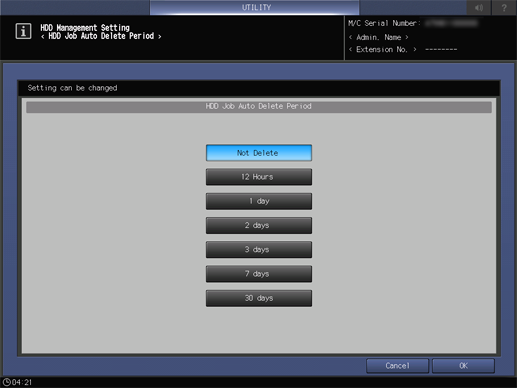 supplementary explanationThe HDD Job Auto Delete Period screen is displayed.