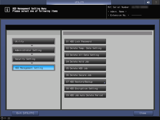 Press Security Setting on the Administrator Setting Menu screen, and then press HDD Management Setting and HDD Job Auto Delete Period in sequence.