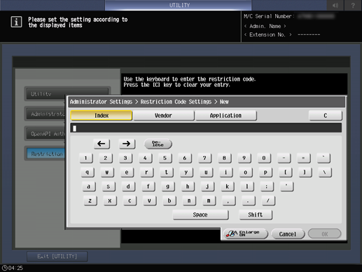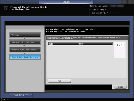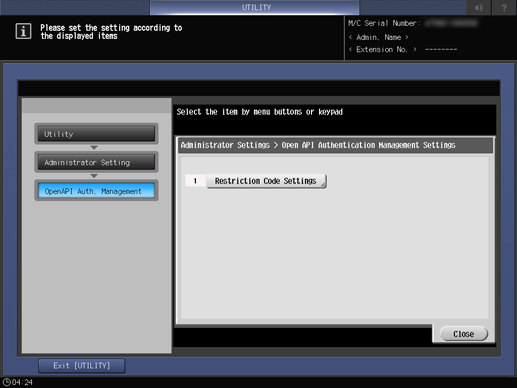 2. Press OpenAPI Auth. Management on the Administrator Setting Menu screen, and then press Restriction Code Settings.