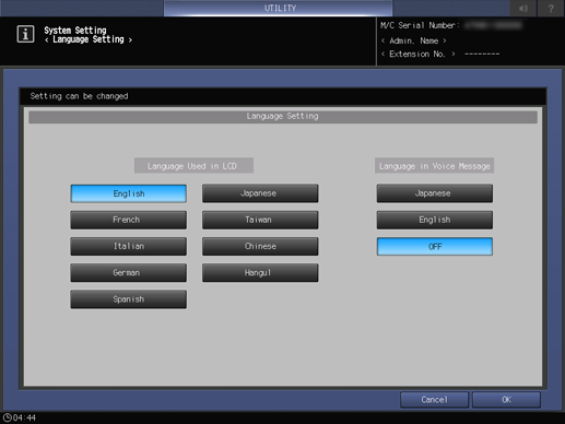 English is selected as default for the language used in LCD, and the voice message is deactivated.