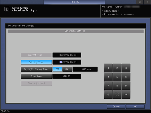 Set the current date and time for built-in clock of the machine, and select whether to use the Daylight Saving Time function. When Daylight Saving Time is set to ON, specify the time lag. Also, use Time Zone to specify the time difference from the universal time. The Daylight Saving Time is deactivated as default.