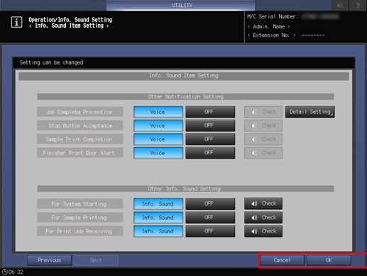• supplementary explanationThe Job Complete Pre-notice provided under Other Notification Setting allows you to specify whether or not to use the expected job completion time for information sound. Press Detail Setting, then select the desired time. Press OK to complete the setting and return to the previous screen.