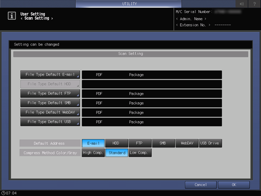 Default Address | Select the default value (destination type) of the SCAN screen. | HDD FTP SMB WebDAV USB Drive | |