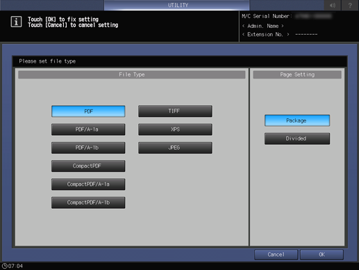 In the File Type item, select the desired file type, then press Package or Divided in Page Settings.