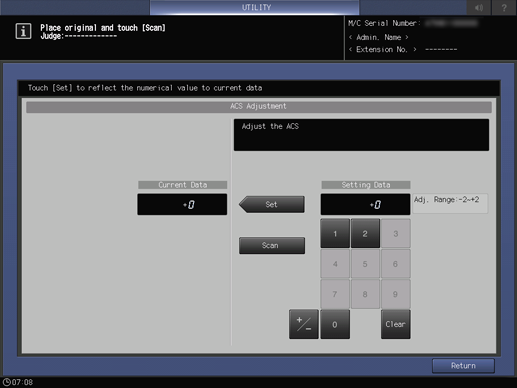 If colored original is read as monochrome, enter a higher value from the touch panel keypad, then press Set. If monochrome original is read as colored, enter a lower value, then press Set.