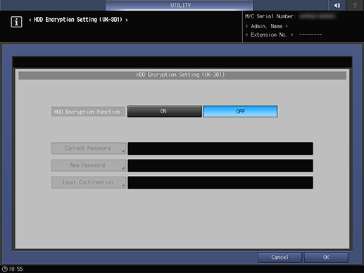 To use the HDD encryption function of the Auto Inspection Unit UK-301, set the HDD encryption function setting to ON.