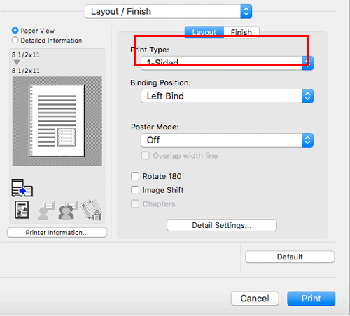In [Print Type:] in [Layout / Finish], select [1-Sided].