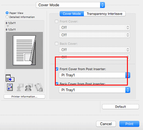 In [Cover Mode], select the [Front Cover from Post Inserter:] and [Back Cover from Post Inserter:] check boxes.
