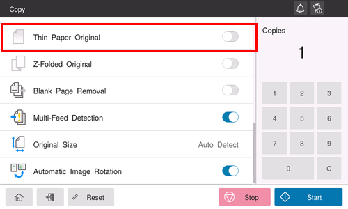 When scanning an original that is thinner than plain paper on the ADF, set this option to ON. This function reduces the original feed speed of the ADF to prevent thin paper from getting caught.