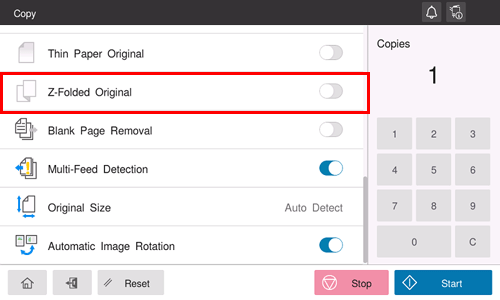 If a folded original is loaded into the ADF, the original size may not be able be detected accurately. To scan the folded original on the ADF, set this option to ON.
