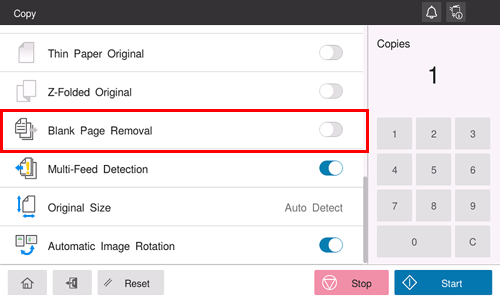 When [Blank Page Removal] is specified to scan an original including blank pages using the ADF, blank pages are excluded from scan targets. Blank pages detected are not counted as original pages.