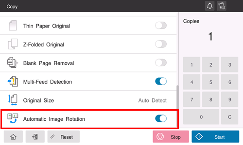 In general use, this machine automatically rotates the original image according to the paper direction to make a copy. Turning [Automatic Image Rotation] OFF as needed enables you to make a copy without rotating the original image. This function is available when you want to copy only a part of the original.