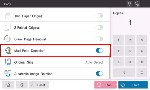 Selecting [Multi-Feed Detection] to ON stops scanning when the machine detects that the original is multiplexed on the ADF.