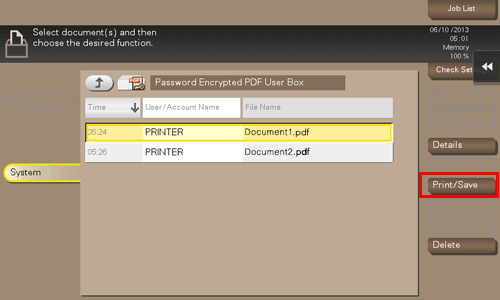 • When printing or saving has completed, the file is deleted automatically from the Password Encrypted PDF User Box.