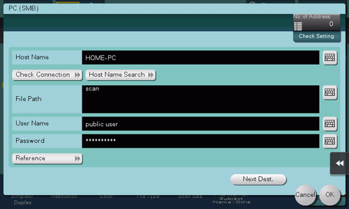 When the authentication screen appears, enter the name and password of the user who has privileges to access the shared folder. After authentication, [Host Name] and [File Path] are set automatically.