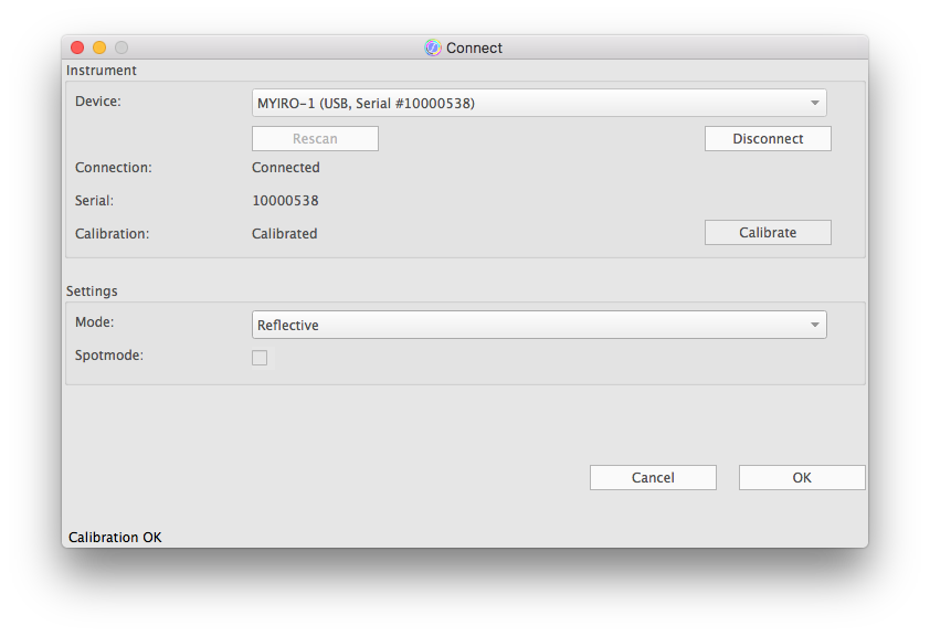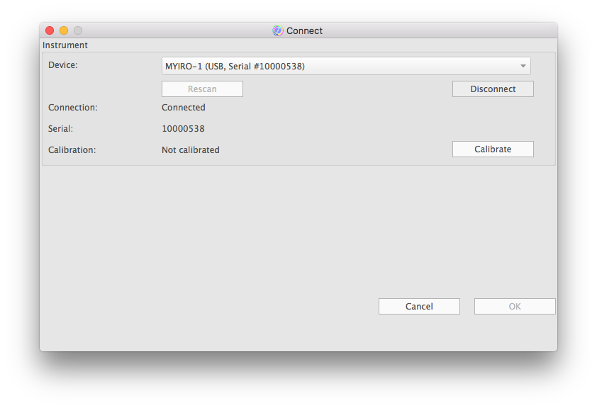 If a measuring instrument has been successfully connected, the “Connect” dialog shows the “connect” status "connected" and at least the serial number of the measuring instrument.