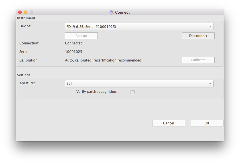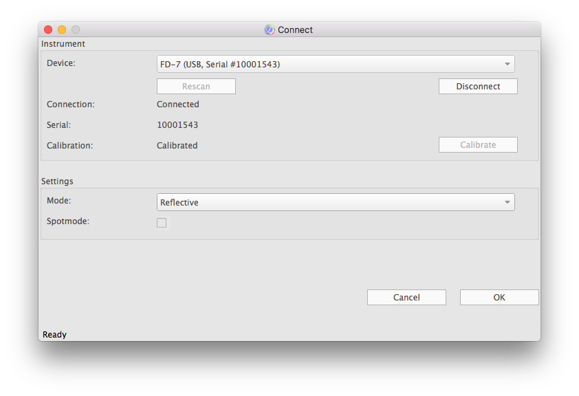 FD-7 / FD-5BT | With the FD-7 and FD-5BT you trigger the calibration on the measuring instrument. Simply make a spot measurement on the calibration tile. Attach the spot measuring shoe to the FD-7/FD-5BT. Place the measuring instrument including the spot measuring shoe on the calibration tile. Press the FD-7/FD-5BT down until calibration is complete. After successful calibration, the Connect dialog will show the calibration status "calibrated". Optionally, you can skip the calibration with the FD-7 / FD-5BT, if you have already carried it out before the connection with the software via the display of the measuring instrument. |