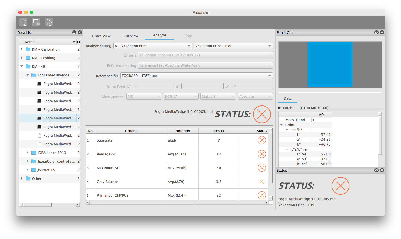 An evaluation setting also contains the parameters for measurement condition, observer, illuminant and density parameters. These settings are automatically applied to the “Patch Color” window and the “List View” tab and cannot be changed while the analysis setting is active.