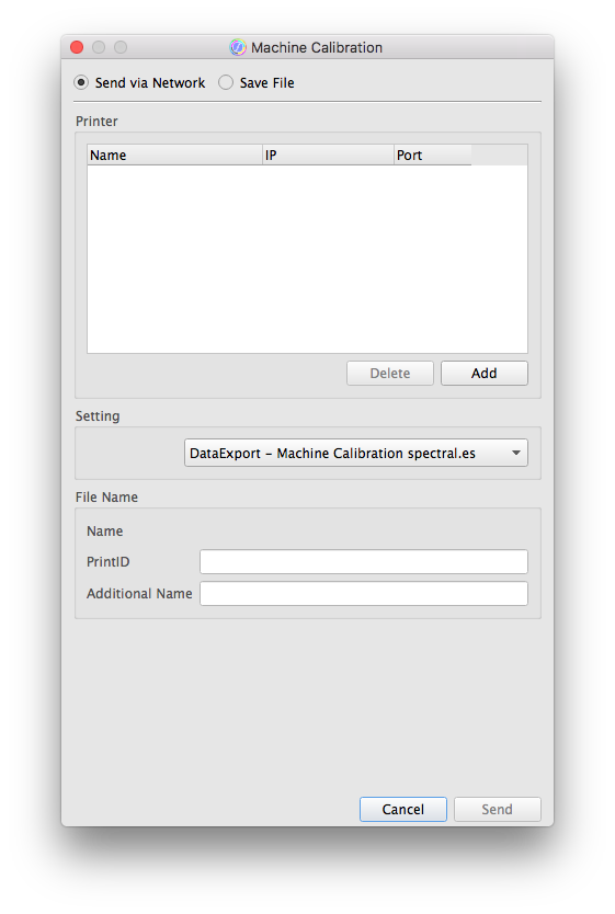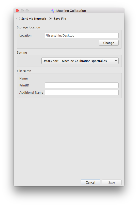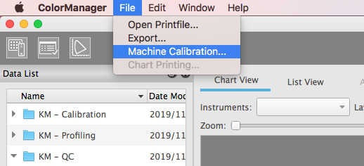 For the calibration of the printer, you usually work with the workflows. Here the export dialog for the machine calibration is automatically called up by the workflow script. If you also want to use the Measure tool for a calibration or if you want to load an old measurement into the machine again, you will find the dialog for exporting machine calibration data under the menu "File -> Machine Calibration".
