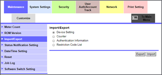 Web Connection - [Maintenance] - [Import/Export]