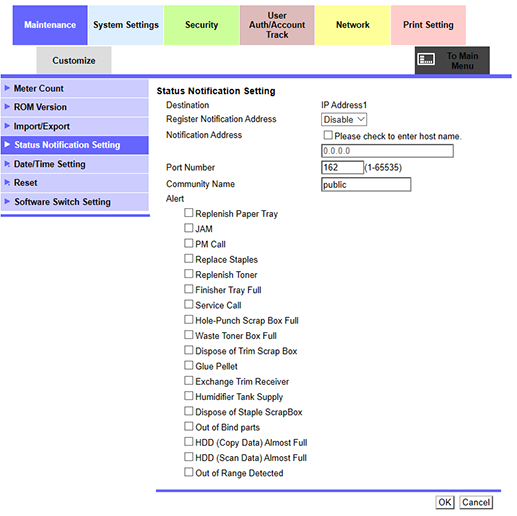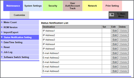 Screen access | Web Connection - [Maintenance] - [Status Notification Setting] | ||