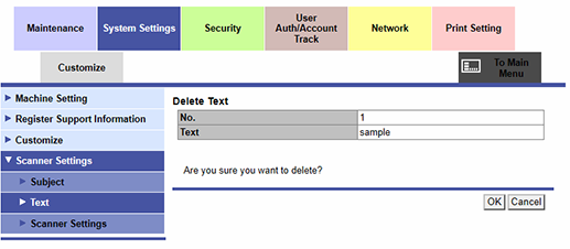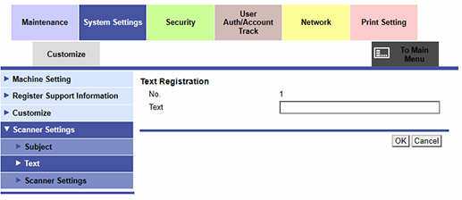 Screen access | Web Connection - [System Settings] - [Scanner Settings] - [Text] | ||