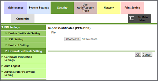 Screen access | Web Connection - [Security] - [PKI Settings] - [External Certificate Setting] | |||