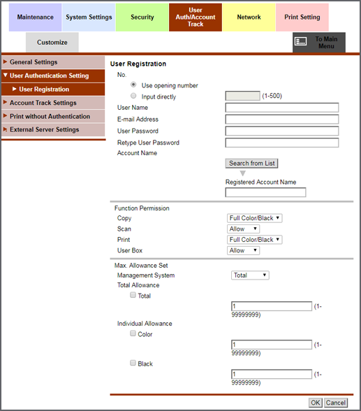 Screen access | Web Connection - [User Auth/Account Track] - [User Authentication Setting] - [User Registration] | ||