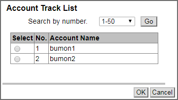[Search by number.] | Makes a search using the user number. Select the range of user numbers from the selection list, and click [Go]; the user numbers in the selected range are displayed. | ||
