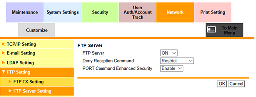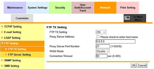 Configure the setting of the proxy server that communicates with this system when performing FTP transmission, or the setting required to use this system as the FTP server.