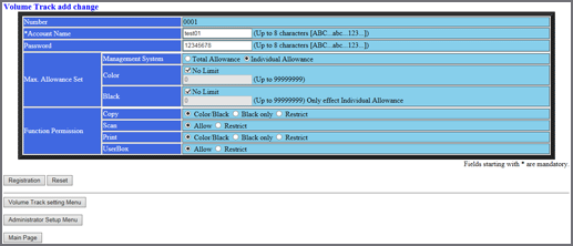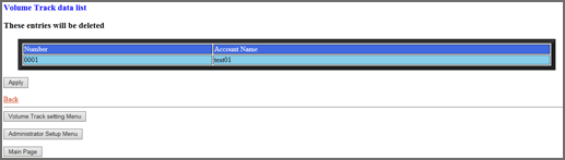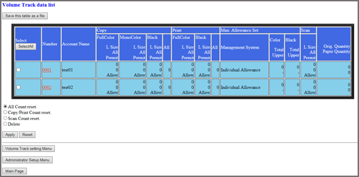 Screen access | Web Utilities - [Machine Manager Setting] - [Volume Track setting] - [Volume Track data list] | |||