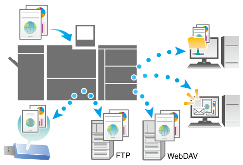 When the system is equipped with the scanner, you can attach scan data to an email for sending, send scan data to the shared PC (SMB server), FTP server, and WebDAV server, or store it on a USB flash drive connected to the system.