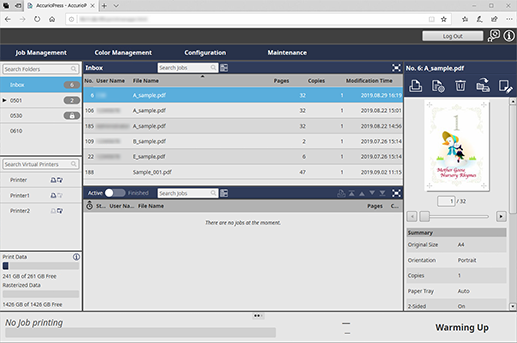 Using this application allows you to easily check the status of this system or perform job management or color management using the computer browser via the network.