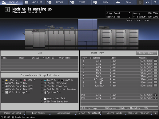 To change to the [COPY] screen, press the [COPY] tab on the screen while warm-up is displayed. If [Ready to set reserve job] is displayed on the [COPY] screen, the original is scanned during the warm-up process, and it can be output immediately when the system is ready to copy.
