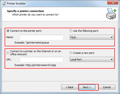 Configure another printer connection (NetBIOS or Port 9100).