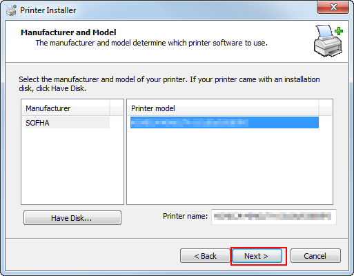 A list of installable printers is displayed. If the printer you want to install is not displayed, click [Have Disk] and select the [Setup.inf] file.