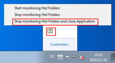 If the icon is displayed in the task tray, right-click the icon and then select [Stop monitoring Hot Folders and close Application].