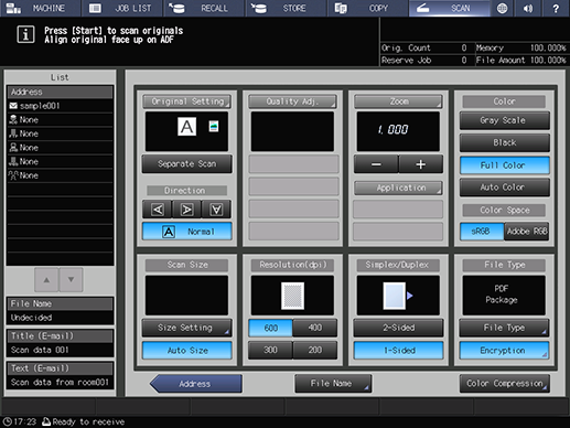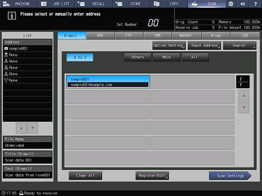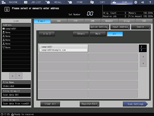 Select the destination address where the scanned data will be sent and press [Scan Settings].