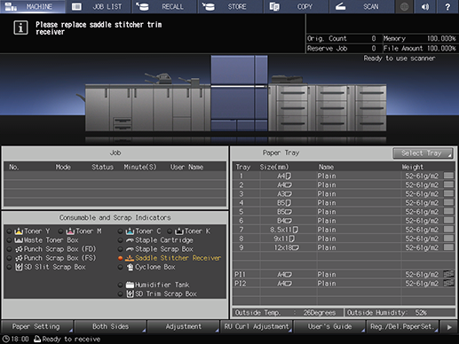 The saddle stitcher trimmer receiver display in the [Consumable and Scrap Indicators] display section will turn red and the text will turn yellow.