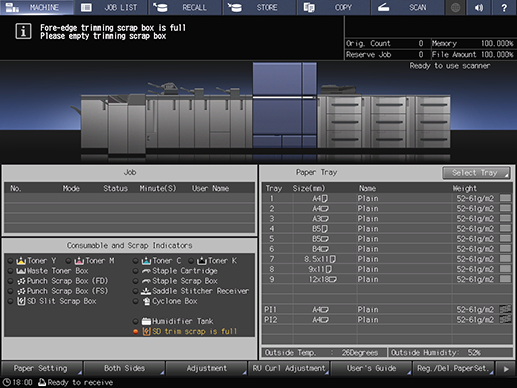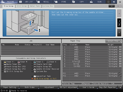 If the trim scrap box for the saddle stitcher, folding mechanism or finisher becomes full, the following messages is displayed in the on-screen information display area.