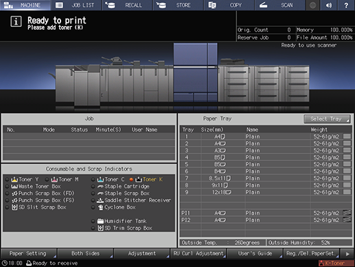 Among the toner color indicators displayed in the [Consumable and Scrap Indicators] display area on the [MACHINE] screen, the color of the toner that has run out lights up red and the text color changes to yellow.