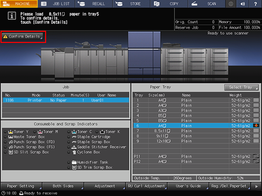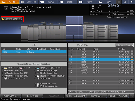 [Please load A3 w paper in tray1 / To confirm details, touch [Confirm Details]]