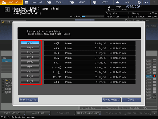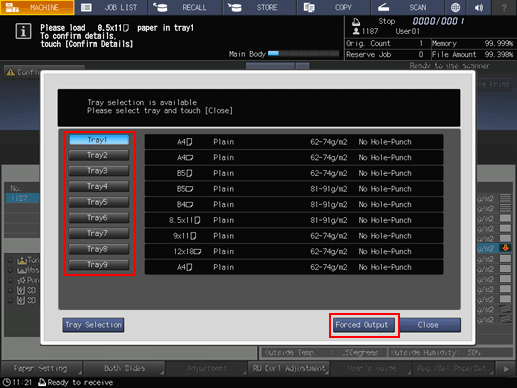 - The tray selected for forced output is used as a paper feed tray until that job ends.